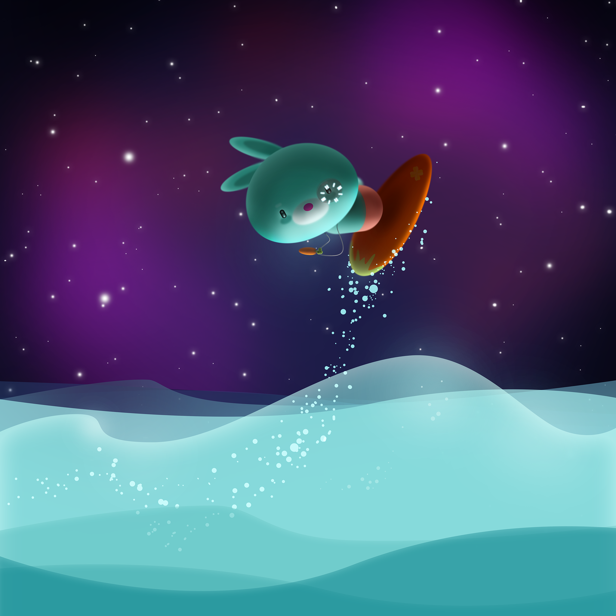 Mebbit enjoyed every day on the asteroid 'P-1618'. Mebbit enjoyed a break by surfing and drinking starlight juice on the beach.