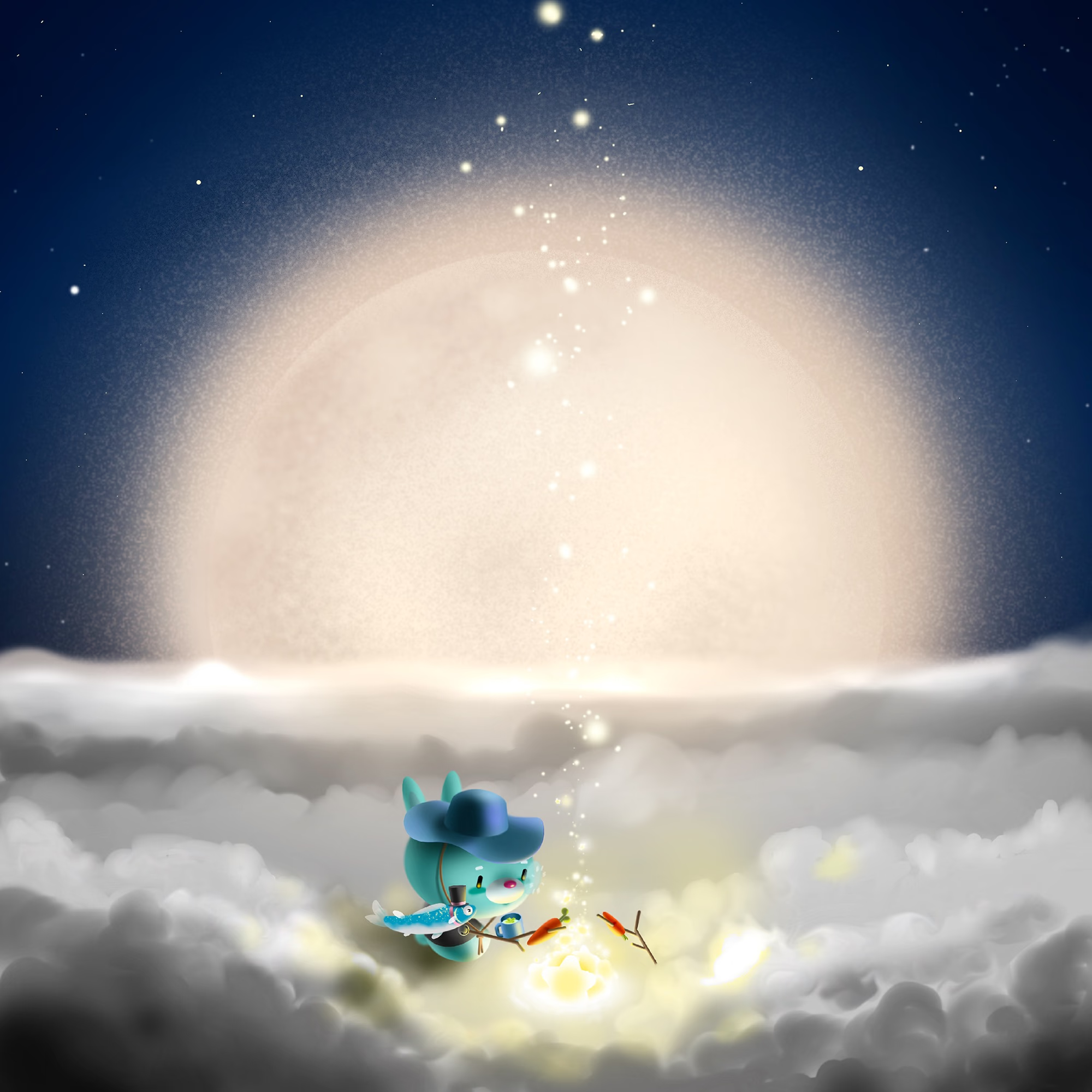Mebbit often goes camping where there is no one. On a lucky day full of clouds, Mebbit can get near the moon. It's quiet and quiet. I can only hear the sound of carrots ripening in the starlight.