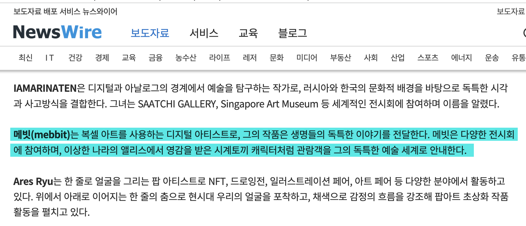 - '동방의 하얀나라' 세계관NFT 기반, 작가 65명 콜라보 전시회 개최 / 머니투데이 / 2022.07.27 ▶
